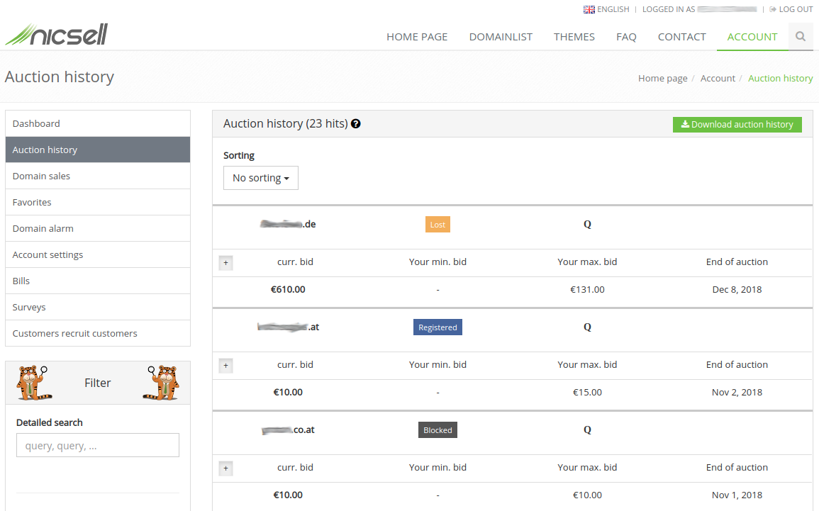 nicsell is a domain backorder service, also known as a dropcatcher, which enables you to bid on a large number of domains that are currently in the deletion phase. Due to our low starting prices and high success rate, we proudly present the best price-performance ratio in the German-speaking world.